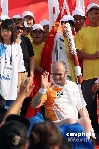 火炬手、國際殘奧委會(IPC)主席菲利普·克雷文(Philip Craven)傳遞火炬。中新社發 張宇 攝