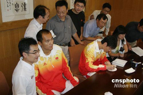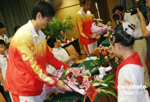 9月5日,北京奧運會佩劍冠軍仲滿、沙灘排球運動員吳鵬根回到家鄉江蘇海安。當地舉行歡迎儀式迎接載譽回鄉的奧運健兒,共同分享北京奧運奪金的喜悅。中新社發 徐瑞平 攝