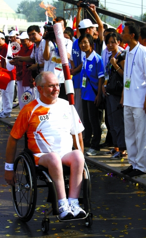 昨天上午,國際殘奧委會主席克雷文在世紀(jì)壇完成了第38棒傳遞。不需幫扶,他用自己強(qiáng)健的雙臂搖動輪椅“跑”完全程,印證了他對“殘疾人需要獨(dú)立”的理念。傳遞時間雖短,但中午記者在其下榻飯店采訪時,他仍余興未盡,他興致勃勃地談起了他對北京、對殘疾人運(yùn)動的看法。