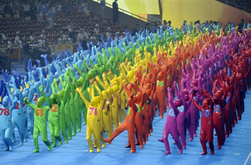 北京2008年殘奧會6日晚八時在國家體育場“鳥巢”揭開神秘面紗,在第一波焰火倒計時結束后,國際殘奧主席發出起跑令,無數身穿著奇異服裝,胸前標有號碼的“卡通玩偶”們不斷跑入鳥巢,他們為來自各國的運動員鋪就一條彩色的跑道。