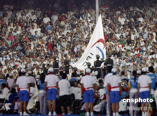 9月6日晚,北京2008殘奧會開幕式在國家體育場“鳥巢”舉行,殘奧會旗在“鳥巢”升起。 中新社發 杜洋 攝