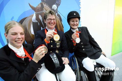 九月八日上午,德國(guó)選手布麗塔·納佩爾(中)在香港奪得北京殘奧會(huì)馬術(shù)比賽個(gè)人錦標(biāo)賽科目級(jí)別Ⅱ冠軍,摘取殘奧會(huì)馬術(shù)比賽首金,加拿大選手勞倫·巴威克(右)獲得銀牌,丹麥選手卡羅琳·尼爾森獲銅牌。中新社發(fā) 洪少葵 攝