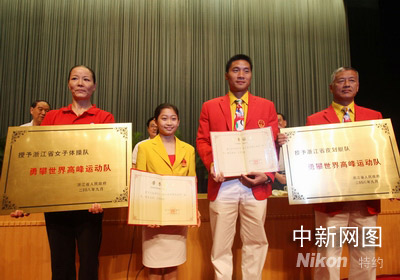 中新網(wǎng)杭州9月8日電(記者 江耘 柴燕菲) 孟關(guān)良、江鈺源、朱啟南、周蘇紅……不久前在北京奧運(yùn)會(huì)上奮力拼搏的浙江籍奧運(yùn)健兒們,今天聚會(huì)在浙江省人民大會(huì)堂里。浙江省委、省政府為他們舉行了歡迎浙江奧運(yùn)健兒凱旋暨慶功表彰大會(huì),并獎(jiǎng)勵(lì)奧運(yùn)冠軍人民幣六十萬元人民幣。