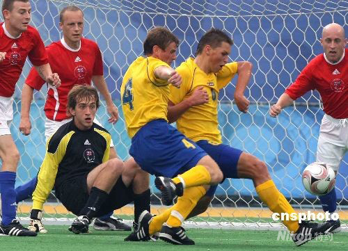 北京殘奧會(huì)七人制(男子)足球比賽9月8日在北京奧林匹克公園內(nèi)的橄欖球場(chǎng)開賽,實(shí)力超群的烏克蘭隊(duì)以8比1擊敗英國(guó)隊(duì)。圖為獨(dú)中三元的烏克蘭隊(duì)6號(hào)伊萬·什克瓦洛(黃)在英國(guó)隊(duì)禁區(qū)內(nèi)恣意沖殺,如入無人之境。殘奧會(huì)七人制(男子)足球比賽在橄欖球賽場(chǎng)舉行,全場(chǎng)共60分鐘。 中新社發(fā) 任晨鳴 攝
