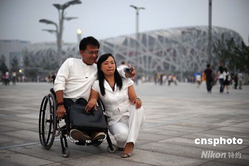 9月8日,北京正在舉辦殘奧會(huì)的國(guó)家體育場(chǎng)外,一位殘疾男青年和伴侶溫情留影。中新社發(fā) 廖攀 攝