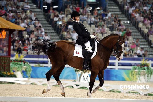 九月十日晚,來自加拿大的選手勞倫·巴威克在香港殘奧馬術個人自選動作科目級別II的比賽中,獲得七十二點七七六分,暫時排名第一。中新社發 洪少葵 攝