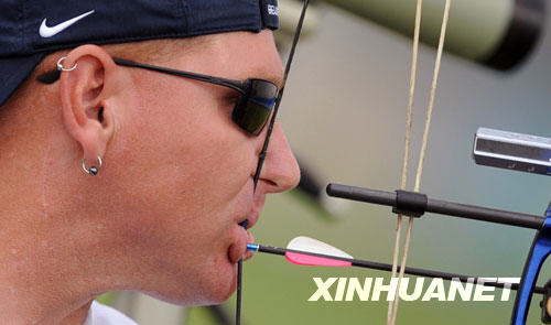 9月9日,在北京2008年殘奧會男子個人復合弓公開級排名賽中,右手殘疾的美國選手埃里克·貝內特用嘴拉弓。新華社記者 索朗羅布攝