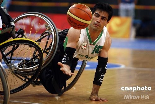9月7日,北京殘奧會輪椅籃球首日比賽中,伊朗隊以73比62的比分戰勝南非隊。圖為伊朗選手倒地奮力救球。中新社發 杜洋 攝