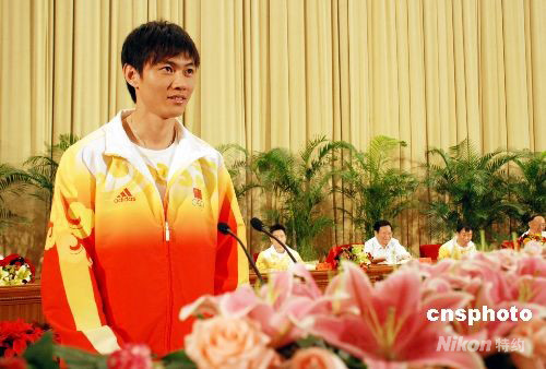 第29屆奧運(yùn)會(huì)男子佩劍個(gè)人冠軍仲滿(mǎn)在報(bào)告會(huì)上發(fā)言。中新社發(fā) 楊慧峰 攝