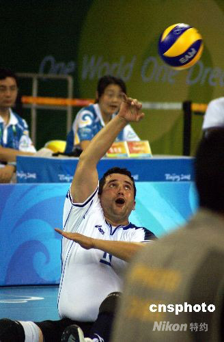 2008年9月12日,在北京殘奧會男子坐式排球半決賽中,波黑隊以3比0戰勝埃及隊,進入決賽。 雙方隊員發球都好似舞蹈。中新社發 馬小剛 攝