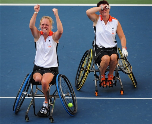 9月15日,北京殘奧會輪椅網球女雙總決賽中,荷蘭22歲的科麗·霍曼(左)和莎倫·瓦爾拉芬2-1戰勝同胞埃絲特·費海爾和伊斯克·格里菲翁,取得本屆殘奧會輪椅網球女雙金牌。賽后這對組合喜極而泣。
