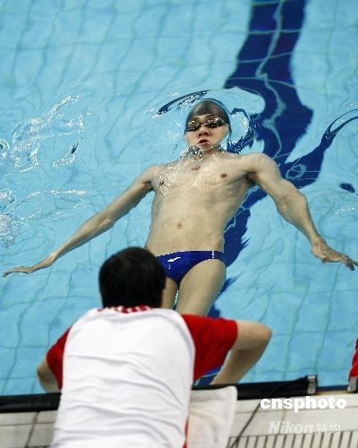 9月15日晚,北京殘奧會男子50米仰泳S3級決賽在北京國家游泳中心“水立方”進行,中國選手李漢華在教練的幫助下準備出發(fā)。中新社發(fā) 盛佳鵬 攝