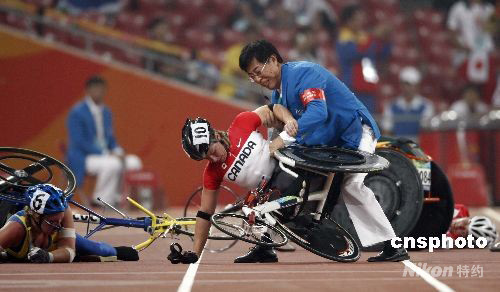 9月8日晚,北京殘奧會(huì)田徑比賽女子5000米T54級(jí)決賽在北京國家體育場(chǎng)“鳥巢”進(jìn)行,選手們?cè)诒荣愔邢嘧驳沟亍2门蟹銎鸬沟氐募幽么筮x手特蕾西·弗爾格。