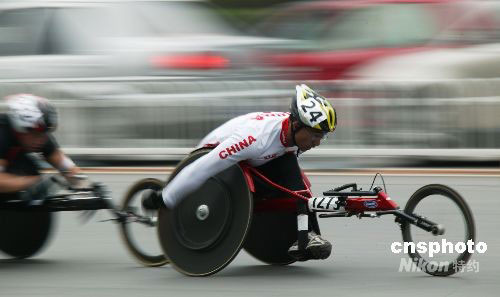 9月17日上午,參加北京殘奧會男子馬拉松比賽T54級別的中國運動員李軍穿越西長安街。中新社發(fā) 馬毅行 攝
