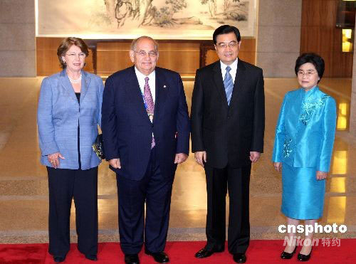 9月17日,中國國家主席胡錦濤與夫人劉永清在北京釣魚臺國賓館芳菲苑舉行宴會歡迎出席北京殘奧會閉幕式的國際貴賓。圖為胡錦濤與夫人迎接約旦親王拉阿德夫婦。中新社發(fā) 廖文靜 攝