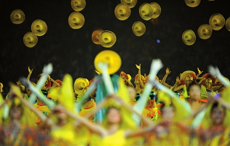 “歡慶篇章”是整臺晚會“寄給未來的一封信”的壓軸戲,而“草帽舞”是“歡慶”中的高潮部分、晚會的亮點之一。昨晚草帽舞華麗登場時,成都的姑娘們從舞臺的左臺口向舞臺的右底角走“斜線一字”,動作整齊,節奏分明,邊行進邊傳遞草帽,她們的隊列沉穩舒緩,時圓時方,變化萬千。到達鳥巢中間時,草帽突然像金色的花朵,從演員手中快速飛出,在空中彼此飛舞,宛如向日葵花簇簇綻放,蔚為壯觀。而在草帽舞隊的四周,還有兩千多人輔以奔放灑脫的舞蹈表演。此時鳥巢內已是掌聲雷動,歡呼陣陣。整個節目傳遞的是青春、是快樂,是少女的激情與奔放,是自由與陽光,是未來的希望,表演服飾也以紅黃為主調,大紅艷麗,大黃成熟,直奔歡慶主題。成都的姑娘們退場后激動地說,她們的自信和當晚的演出成功,離不開奧組委領導的關心支持。據悉,這批專業演員全部由成都市文化藝術學校的專業舞蹈學生、演員和舞蹈教師組成。(周帥)