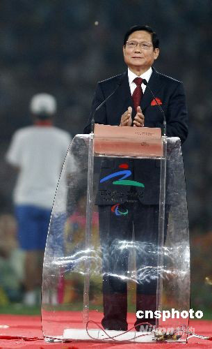 9月17日晚,北京2008年殘奧會(huì)閉幕式在國(guó)家體育場(chǎng)舉行。圖為北京奧組委主席劉淇致辭。中新社發(fā) 杜洋 攝