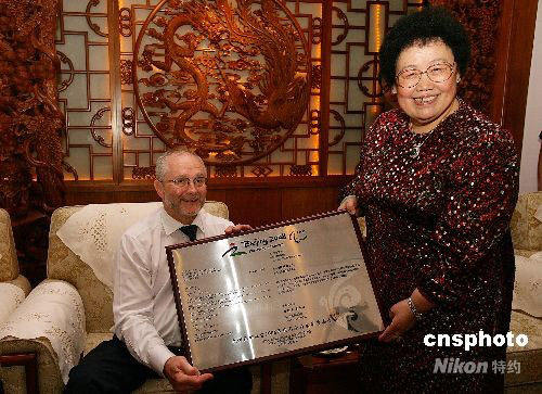 菲利普·克雷文代表國際殘奧委會向陳麗華館長贈送感謝狀。中新社發 毛建軍 攝