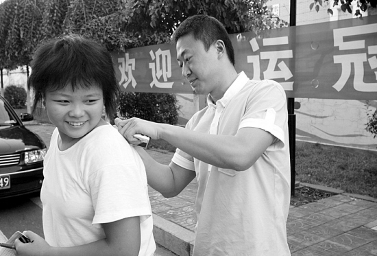 簽名、合影,幾乎成了馬琳昨天重復(fù)最多的兩個動作。馬琳則一概表現(xiàn)出巨大的耐心,全力配合。一位胖胖的小女孩一直跟隨了馬琳走出幾十米后還沒簽上名。“我不敢!”小女孩說。看著馬琳走到訓(xùn)練館門前,即將上車,小女孩終于鼓起勇氣沖上前去要求馬琳簽名。“給我簽在背上好嗎?”小女孩要求。馬琳于是轉(zhuǎn)到女孩身后,在女孩的衣服上鄭重簽下了自己的名字。