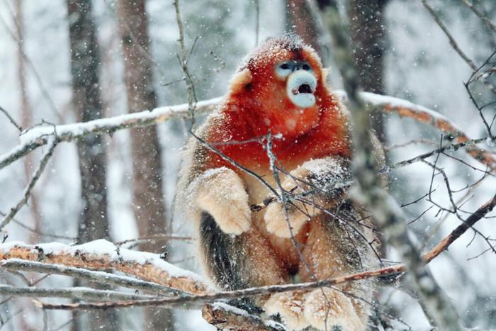 湖北寒潮來襲 金絲猴“雪中作樂”
