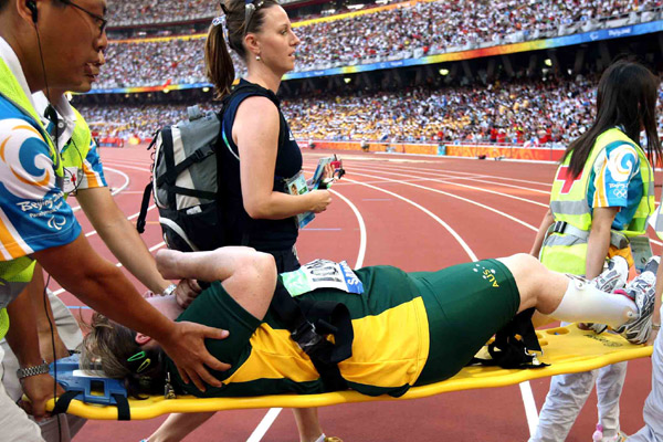 殘奧會進(jìn)入第6個比賽日,產(chǎn)生了54枚金牌。在這一天里,金牌主要擊中在田徑、游泳和公路自行車三個大項(xiàng)上。田徑和游泳依然是產(chǎn)生金牌的“大戶”,各自決出18和16個冠軍。在“鳥巢”進(jìn)行的比賽里,女子5000米T54級決賽因?yàn)樽曹嚩刭,在男子三級跳遠(yuǎn)F11級決賽里,雅典殘奧會兩金得主中國盲人跳遠(yuǎn)名將李端打破世界紀(jì)錄為中國代表團(tuán)再添一金。