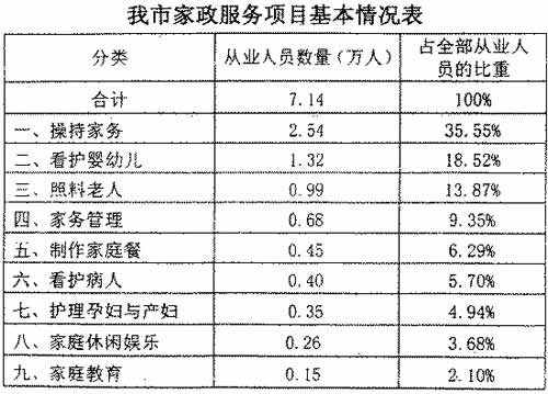 家庭服務(wù)業(yè)是以家庭為服務(wù)對(duì)象,以家庭各種事務(wù)為服務(wù)內(nèi)容的第三產(chǎn)業(yè),主要包括家庭服務(wù)、維修服務(wù)、社區(qū)導(dǎo)購(gòu)、房屋租售、人才招聘、法律服務(wù)、生活百事等七大類服務(wù)內(nèi)容,涉及千家萬戶。目前,沈陽有從事該行業(yè)的各類家政服務(wù)企業(yè)558個(gè),現(xiàn)有家政服務(wù)從業(yè)人員約7.14萬人,而社會(huì)對(duì)家政服務(wù)人員的需求則達(dá)到11萬人。家庭服務(wù)業(yè)成了當(dāng)前和今后一個(gè)時(shí)期促進(jìn)就業(yè)的一條重要渠道。