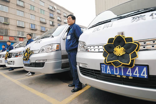白、灰、棕三色相間的車(chē)身上有“沈陽(yáng)殯儀”標(biāo)志,號(hào)牌后三位均為“444”。10月28日,沈陽(yáng)市殯儀車(chē)集體換裝,在全國(guó)率先開(kāi)始統(tǒng)一殯儀車(chē)標(biāo)識(shí)。年底前,全市70多輛正規(guī)殯儀車(chē)將全部“變身”換裝。