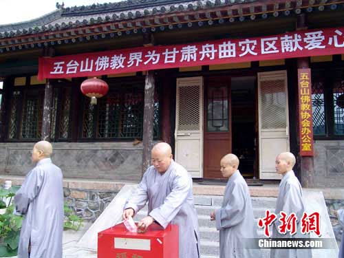 23日上午8時左右,五臺山佛教協會門外,不約而同趕來的五臺山各寺廟的師傅們排成了幾條長龍,飽含著對舟曲災區人民的關愛之意,捧出一片愛心,神圣地放入了捐款箱中,從而掀起了五臺山佛教界向舟曲災區人民送溫暖、送愛心的高潮。