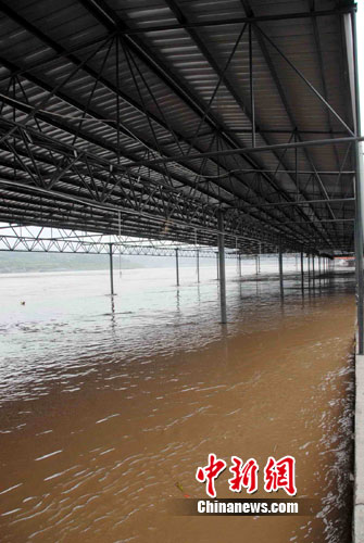 從22日下午開始,長江重慶段水位持續上漲,逐漸淹沒了重慶菜園壩水果市場的部分攤位和倉庫,當日,不少商家開始將西瓜搶運到安全地帶。記者今天在該市場看到,上漲的江水淹沒了約八、九十家商家的攤位,不少沿江而下的漂浮物堆積在攤位附近。