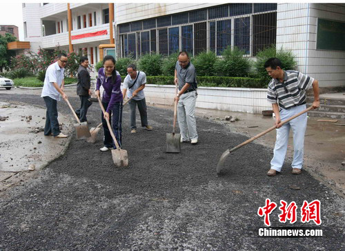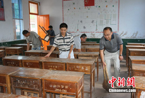 在工地上,記者見到了正在監(jiān)督工程質(zhì)量的官盛鎮(zhèn)小學(xué)校長袁道川,過于疲倦的雙眼深陷,但仍顯得精悍而干練。“從7月18日起,我們的教職員工和班子成員都在堅(jiān)守崗位,由于今年的水位高、淤泥多,校園恢復(fù)重建難度相當(dāng)大。為了對全鄉(xiāng)的中小學(xué)生負(fù)責(zé),必須加班加點(diǎn)地重建。300套學(xué)生桌凳全部到位,8月30日,學(xué)生順利入學(xué)沒有問題。”