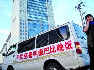 發起人之一王一飛的朋友透露,巴比晚宴可能在盤古七星酒店舉行,便一路駕車來到盤古大觀,車上的“平民慈善叫板巴比晚飯”字幅,引起路人圍觀。
