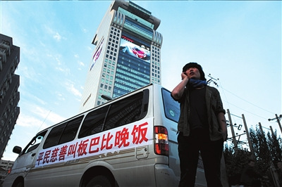 “平民慈善叫板巴比晚飯。”昨天下午5點,朝陽區北四環中路盤古大觀酒店樓下,一輛白色面包車身上的挑釁口號引得周圍市民駐足觀看。