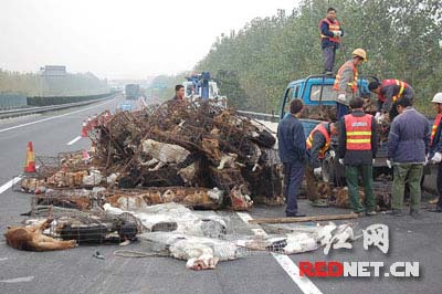 23日凌晨5時許,一臺中型貨車在京珠高速公路湖南段78公里側翻,貨車上運載的兔子和狗在高速公路上到處亂竄,許多司機為避讓干脆將車停在超車道上。為保障交通安全,交警和施救人員只得在高速公路上四處抓捕、圈圍這些狗和兔子。