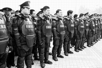10月27日,近千名執(zhí)法隊(duì)員聚集綠城廣場,其中站著一些身著“盔甲”的“防暴警察”,他們就是各區(qū)負(fù)責(zé)查處非法養(yǎng)犬的專業(yè)執(zhí)法隊(duì)員。