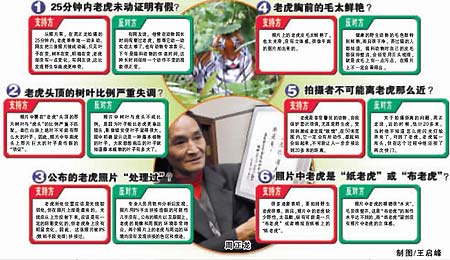 然而,10月19日,中科院植物所首席研究員、植物學專家傅德志在自己的網站上發表文章稱,他認為,公布的照片中老虎頭上的那個葉子,在秦巴山區就不可能有那么大的,“幾乎遮擋老虎大半個臉”,認為老虎百分百是假的。他發帖稱“我也拿腦袋擔保,照片中的老虎是假的!”
