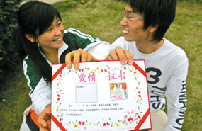 小郭首先在學校里推出了“愛情證書”,受到同學們的青睞,然后他又接著在校園網“貼吧”推廣。目前已有不少大學生情侶訂購。