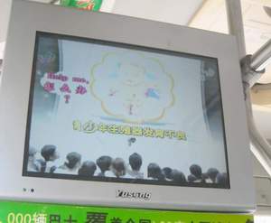 6日上午10時(shí)20分,記者在龍昆南路海師大門口處的車站登上了42路公交車。此時(shí),設(shè)在司機(jī)后座上方的一個(gè)顯示器里,正滾動(dòng)播出視頻廣告。廣告的內(nèi)容有電影廣告,食品廣告等。