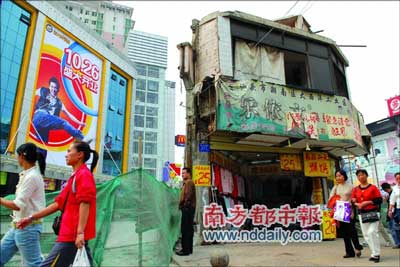 本月9日開(kāi)始,一篇題為《長(zhǎng)沙最牛釘子戶(hù)三年未拆除》的帖子開(kāi)始在網(wǎng)上各大論壇流傳,將默默挺立了三年的三顆“釘子”擺到了人們眼前:一座全新裝修、開(kāi)業(yè)不久的商場(chǎng)大樓,門(mén)前廣場(chǎng)靠馬路邊處,則是相距不遠(yuǎn)一字排開(kāi)的三座破舊房屋。
