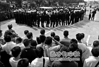 現(xiàn)場一片緊張的氣氛。20多名男女聚集在蘿崗區(qū)宏明路16號門口,面紅耳赤地吼叫著。他們旁邊是一輛保險(xiǎn)杠和雨刮都不知去向的面包車,窗前支著一塊“運(yùn)政稽查”紅色牌子;他們身旁是由特警、民警、輔警和治安隊(duì)員百余人組成的一道封鎖線和約250平方米的封鎖區(qū),封鎖線旁則是數(shù)百圍觀的群眾。