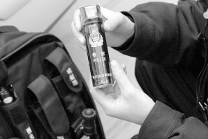 當民警清查至酒店一個房間時,房間內(nèi)的不法人員拒不開門接受檢查,并堵在房門處將門反鎖,民警幾次用鑰匙開門均未成功。民警見狀,果斷拆下房門“貓眼”,決定首次使用單警裝備中的催淚噴射器,制服抗拒的不法人員。只見一個管狀警用裝置,伸向了貓眼處,隨著發(fā)射命令的下達,霧狀物質(zhì)隨即噴進了屋中。這個管狀物品原來就是催淚噴射器,聽到屋中一陣響動并伴有咳嗽聲后,民警立即沖開了房門,看到一男一女正抱頭蹲在地上,眼淚不斷的流出。此時,兩人已經(jīng)失去抵抗能力,警方隨即將二人控制。