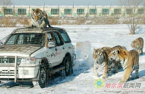 這時,馴養員的投食車駛入園內,老虎知道要開飯了,迅速圍攏過來。隨著一次次撲躍,一只只活雞被老虎叼到嘴里,一只心急的老虎縱身跳到車上,隔著鐵絲網守著投食的天窗不肯離開,直到馴養員伸出木棍驅趕,它才悻悻離去。