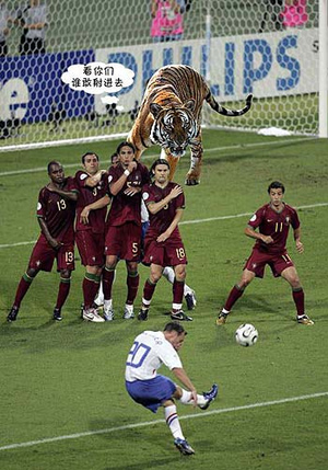 一些網友還為華南虎賦予“靈性”,讓它參與了激烈的足球賽,甚至做起了“門衛”。在球賽版的PS照片中,華南虎成為了守門員,正“虎視眈眈”地盯著“對手”,甚至還威脅“看你們誰敢射進門”(網友設計臺詞),那場景讓人忍俊不禁。