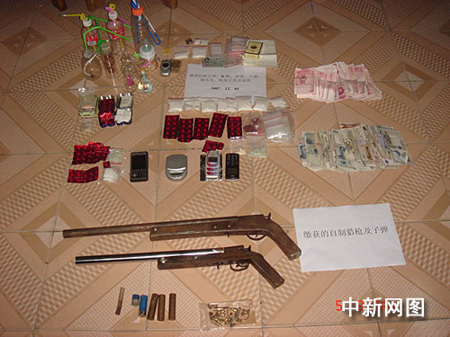 中新網韶關12月7日電(馮昶 陳文明 張黛虹)廣東韶關樂昌市警方今天稱,警方在日前開展的代號為“搜狐”的緝毒行動中,成功抓獲了販毒犯罪嫌疑人6名,當場繳獲自制獵槍2支,子彈4發,搖頭丸、冰毒等一大批毒品,以及毒資人民幣5000多元。至此,一個在樂昌市區娛樂場所販賣毒品的特大涉槍販毒團伙被警方成功摧毀。