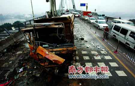 泥頭車再惹是非!昨日清晨6時許,一輛滿載水泥磚的泥頭車在廣州荔灣區(qū)鶴洞大橋橋面北往南爬坡行駛時,突然失控撞倒護欄,一頭撞向迎面駛來的一輛中巴,差點將中巴撞下20多米高的橋。中巴上的30名司乘人員受傷,其中4人重傷。