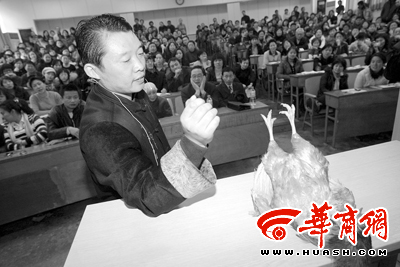 “貓最怕什么?”“老鼠”!這不是在玩腦筋急轉彎;一名懸空躺下的男子膝蓋上站著一位成年人,這也不是在練硬氣功;眾目睽睽下,通過“交流”,一只正在奮力掙扎的母雞很快安靜下來,這更不是因為它能聽懂人話。這是昨日在西安第四軍醫(yī)大學舉行的一場“自然催眠療法”公益演示會上,聽眾進行的一次“催眠之旅”。