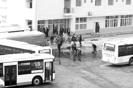 記者在現場附近一高樓上看到,停車場內一角落邊停放著四輛公交車,有的車玻璃已碎裂,車上可明顯看到被火燒過的痕跡。場內幾名工作人員推著板車在運一些烏黑的物體,十個人在幾輛公交車圍起的地方忙著清洗烏黑的地面,旁邊還停著一用塑料布包裹嚴實的物體。場內有人發現記者在拍攝,又叫來一部公交車將清洗的地方圍起來。