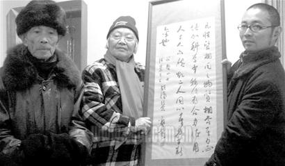 昨日下午,記者來到兩位老人家里,見老人們的兒女攙扶著兩位老人,拿出了跟隨他們夫妻60余年的郭老真跡。四川省博物館副館長魏學峰接過捐贈的書法后,向老人頒發了《文物征集獎勵證書》,并表示感謝。