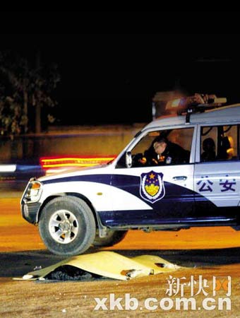 傍晚時(shí)分,死者尸體仍在路邊,一輛警車一直守在死者旁邊。