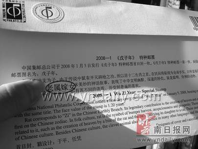 記者隨后來到楚雄集郵經(jīng)營(yíng)部,花了2.2元也購(gòu)買了一枚《戊子年》特種郵票首日封。該套首日封編號(hào)為2008-1,印量30萬枚,封上還加貼了中國(guó)集郵總公司的防偽標(biāo)簽。當(dāng)記者向工作人員詢問首日封文字中出現(xiàn)的錯(cuò)誤時(shí),這位工作人員顯然完全不知情,經(jīng)提醒看到后,她連連表示,這樣的情況以前從未發(fā)生過,這還是頭一次碰到。她隨即拿出和首日封一起配套發(fā)行的一套鼠年郵票仔細(xì)查看,記者注意到,上面有首日封設(shè)計(jì)者于平和任憑的介紹,并且在多處出現(xiàn)了“老鼠嫁女”的字樣,但并無任何差錯(cuò)。據(jù)工作人員介紹,首日封在楚雄的發(fā)行量?jī)H70枚,目前已銷售了近40枚。(王維娜 攝影報(bào)道)