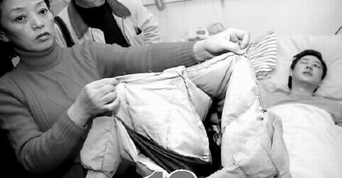 媽媽從床邊拿起一件乳白色羽絨衣,上面滿是腳印,已被撕扯得破爛不堪。“當時,我兒子就是穿著這件羽絨衣去采訪,事情發生后,三四個人沖上來搶攝像機,我兒子把攝像機藏在羽絨服里,那些人搶不到機器,對他拳打腳踢,他的背上全是腳印!”話未說完,媽媽就泣不成聲了。爸爸憐愛地注視著兒子,默默無言……
